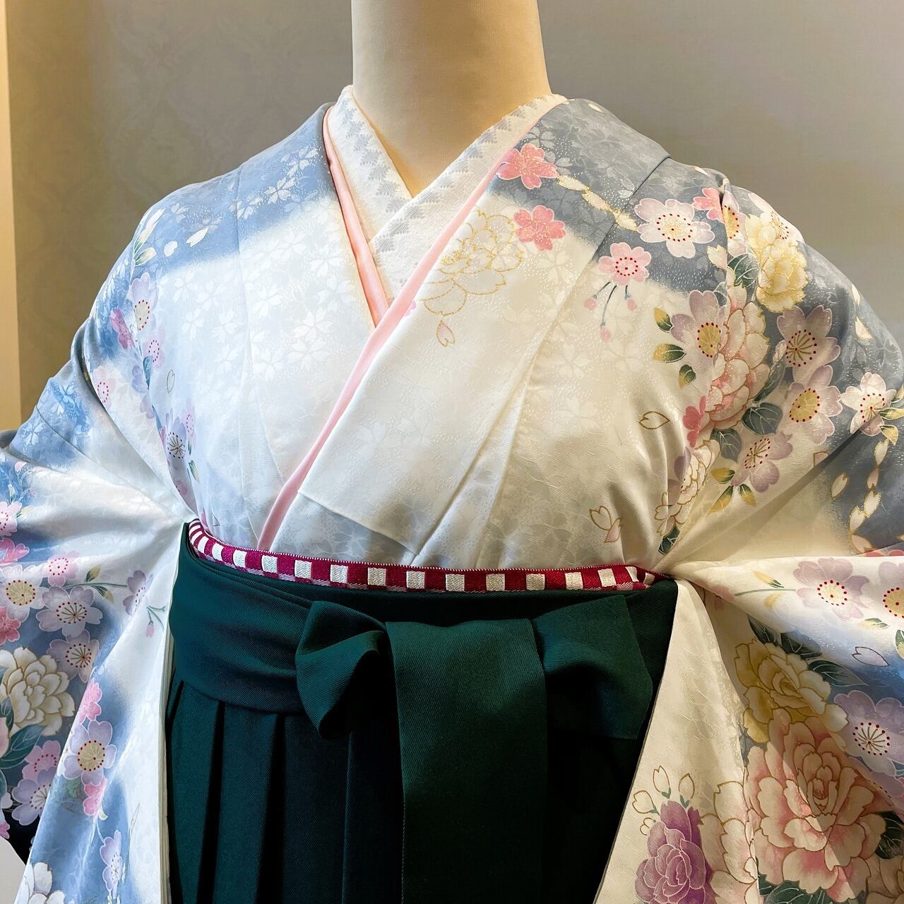 web予約限定価格【卒業式 袴レンタル】白/水色/紺 花柄 着物 x グリーン花柄刺繍袴(Sサイズ) フルセットレンタル [袴-103-302S] 令和5年度卒業式