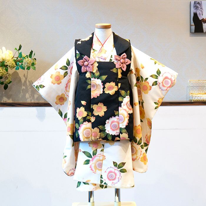 web予約限定価格【七五三着物レンタル】 3歳 女子 被布[黒被布/白着物 梅模様] フルセットレンタル [753-F3-102]
