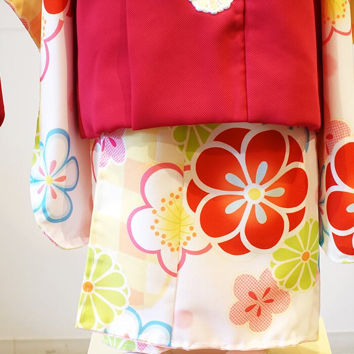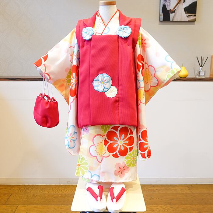 web予約限定価格【七五三着物レンタル】 3歳 女子 被布[萌黄 紅被布/ベージュ着物 梅模様] フルセットレンタル [753-F3-moe1]
