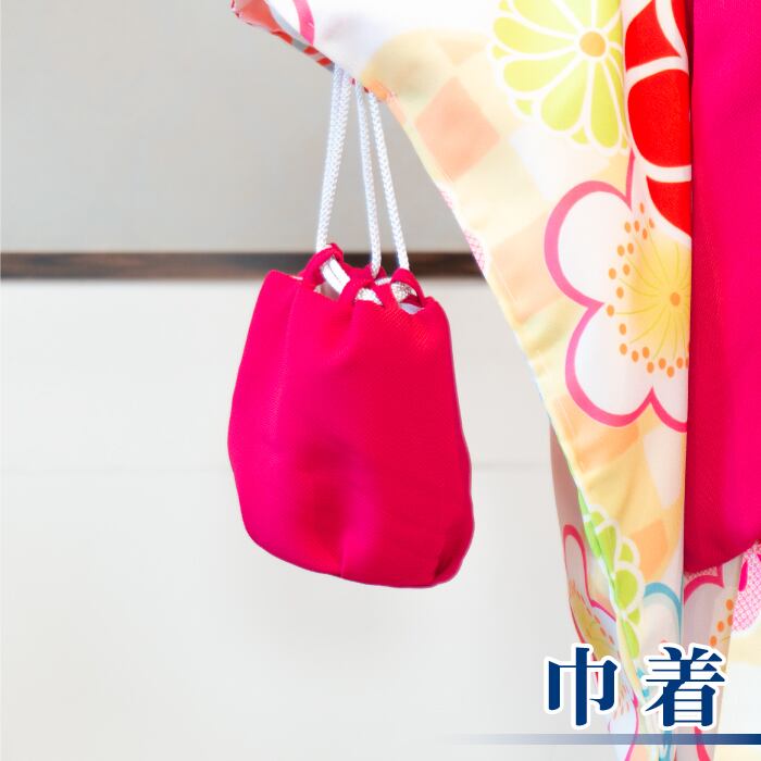 着物、被布コート、長襦袢、髪飾り、腰紐、草履、巾着