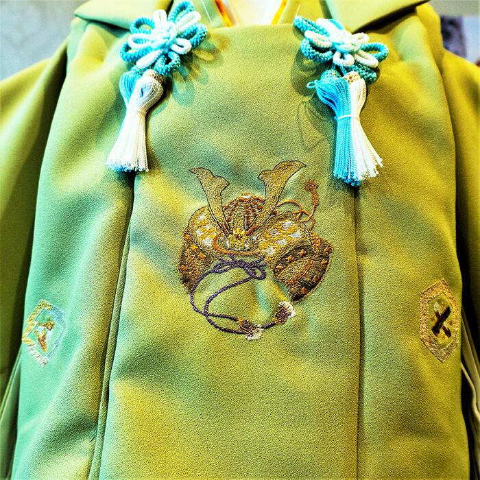 web予約限定価格【七五三着物レンタル】 3歳 男子 被布 しゃれっこ 王-2D 緑地に兜 フルセットレンタル[753-M3-O2D]